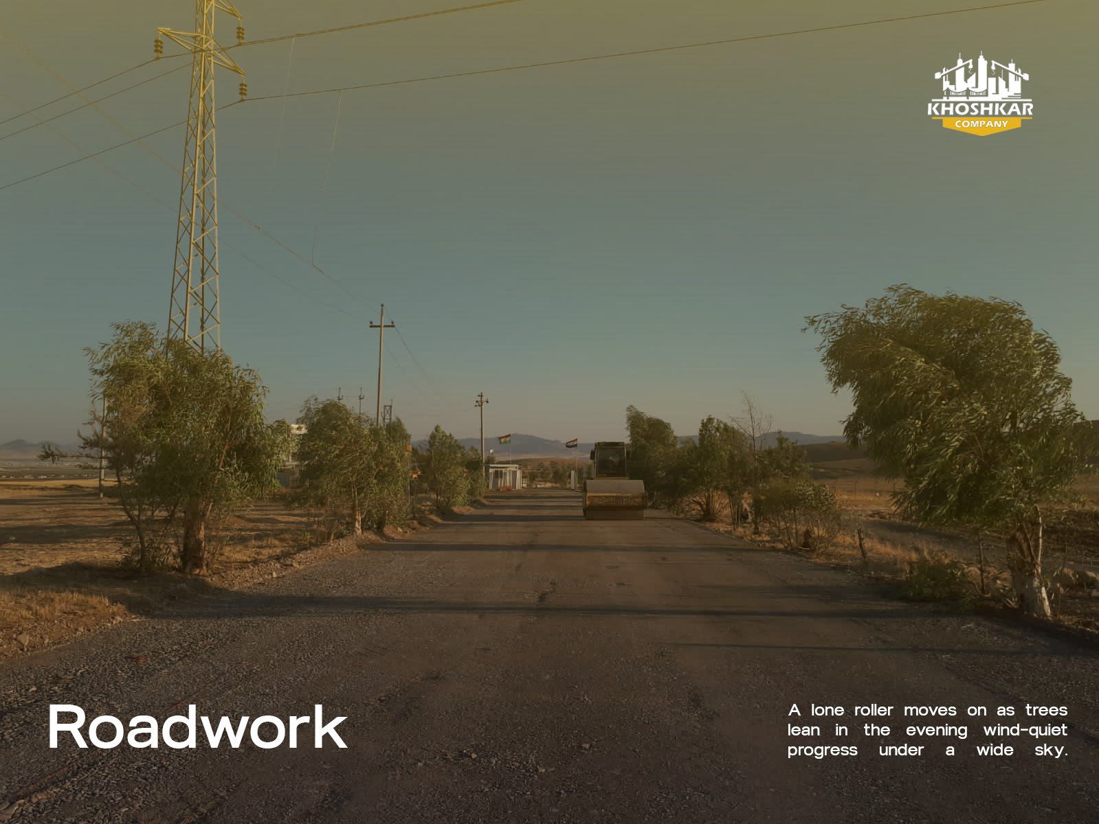 A lone roller moves on as trees lean in the evening wind—quiet progress under a wide sky.