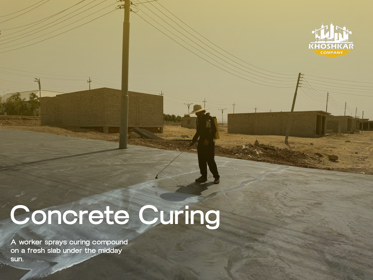 A worker sprays curing compound on a fresh slab under the midday sun.