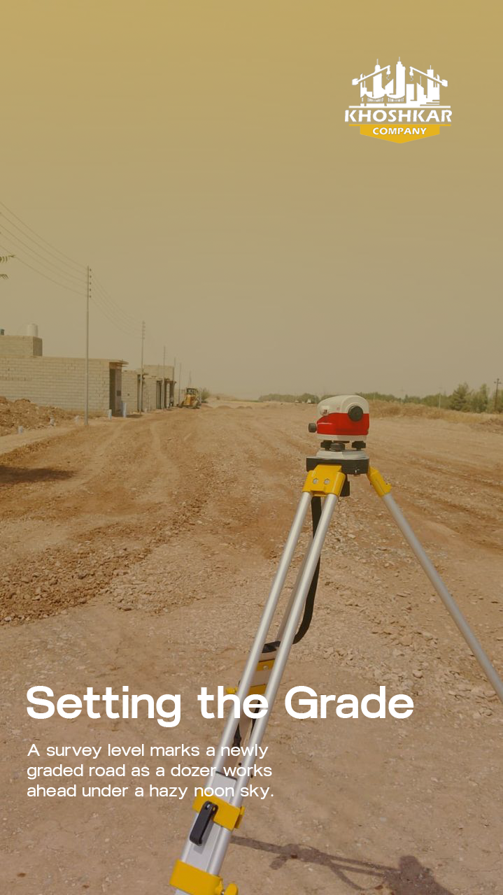 A survey level marks a newly graded road as a dozer works ahead under a hazy noon sky.