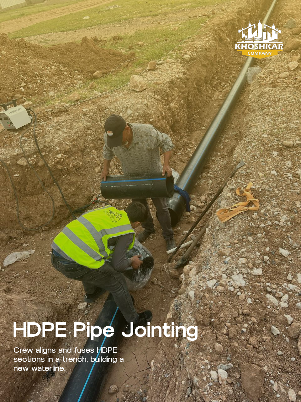 Crew aligns and fuses HDPE sections in a trench, building a new waterline.